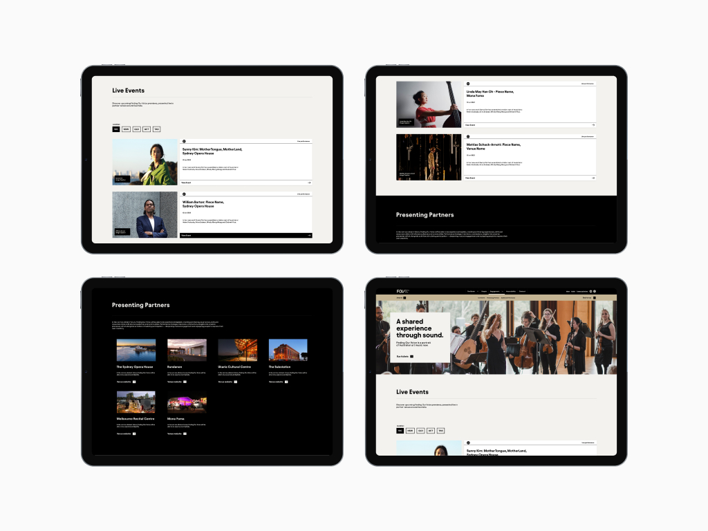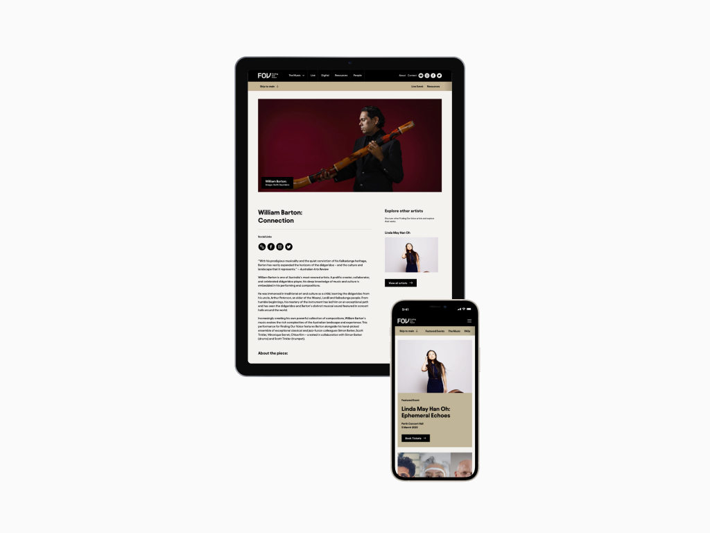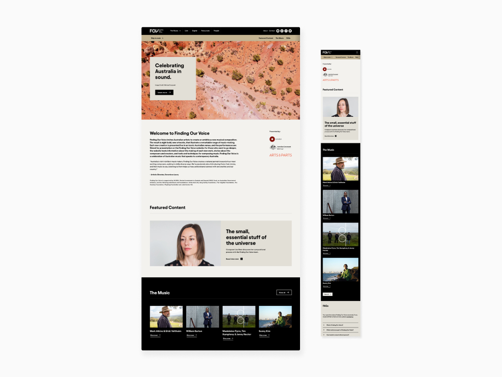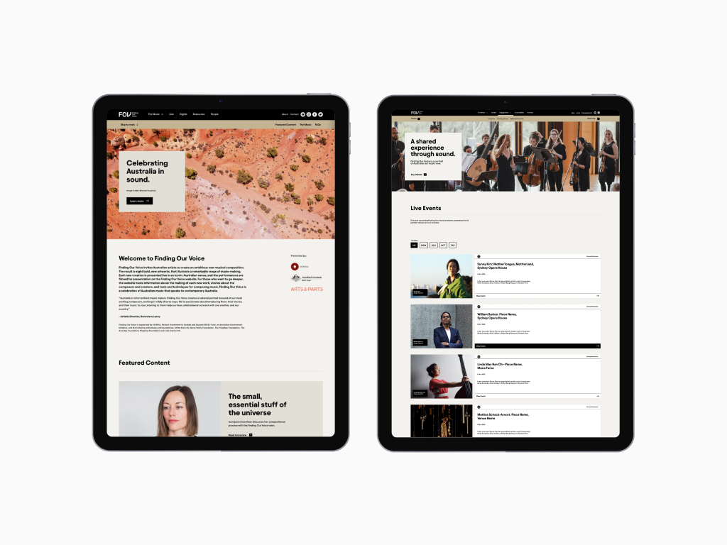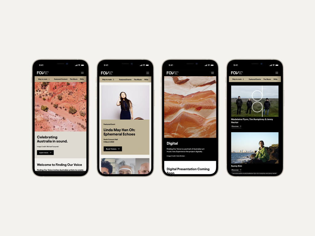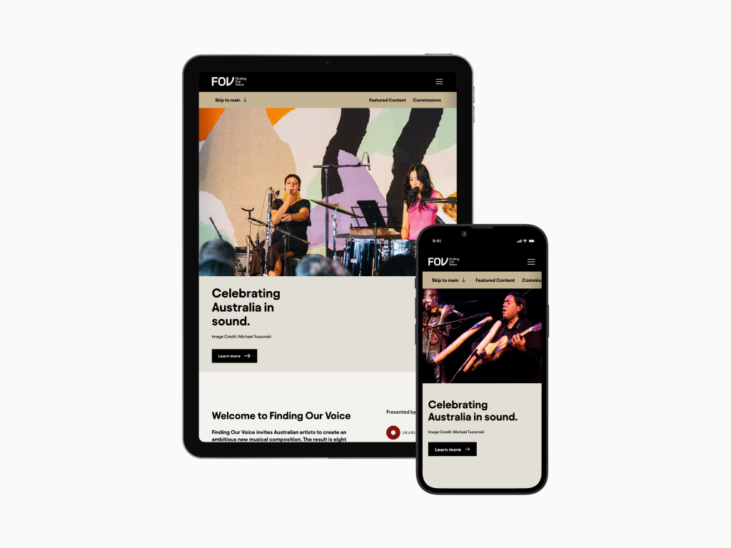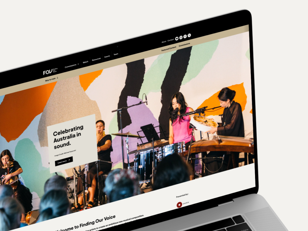 Brand, web design and development for Finding Our Voice. Celebrating Australia in sound, this digital festival commissions new musical works, and presents standalone live performances for audiences in locations across the country.